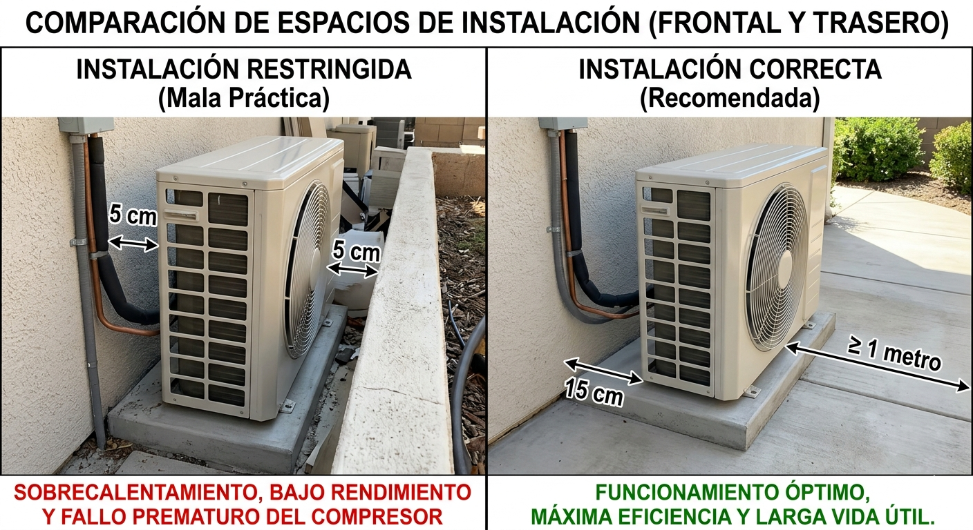 Respecto a la ubicación debemos considerar varias cosas, primero lo que mencionamos antes sobre las unidades exteriores pegadas al techo. Luego que tenga una separación respecto a la pared, para mejorar el flujo de aire que circule, y el frente debe tener un espacio para intercambiar temperatura, y en lo posible que no tenga una fuente de calor de frente, por ejemplo, dos unidades exteriores enfrentadas. Ya que expulsarían el calor entre ellos llevando a una elevada temperatura del refrigerante, haciendo que se reduzca el salto térmico en el interior o que nuestro compresor trabaje forzado y se sobrecaliente, lo que conllevaría una actuación del protector térmico. Y en el caso que este no actúe, puede llegar a generar un bloqueo del motocompresor.
